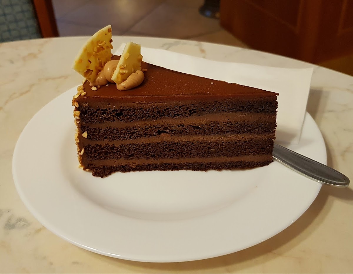 Ausgezeichnete Esterhazyschnitte, Melange Kaffee mit viel Schlagobers (sehr gut)